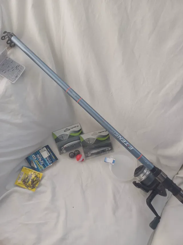 Set completo para pesca. - Caña de pescar extensible. - Carrete de pesca. - Señuelos. - Plomos. - Anzuelos.