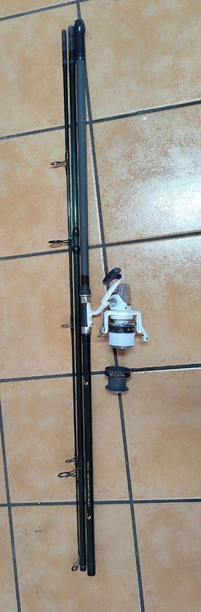Caña de pescar surfcasting de carbono de 3 tramos. Longitud: 4,20 m Marca: Juli Suprema. Carrete y bobina de repuesto.