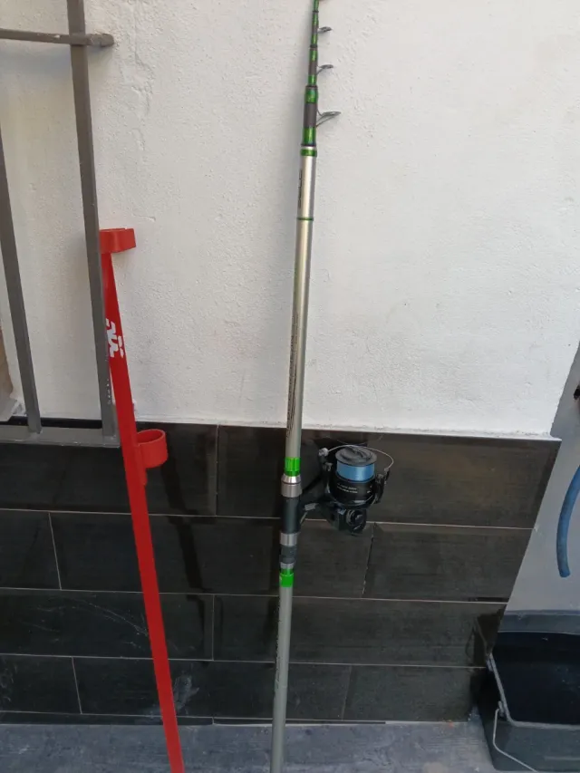 Conjunto de pesca para surfcasting. Incluye pincho soporte caña - Caña telescópica de varias secciones. - Carrete de pesca acoplado.