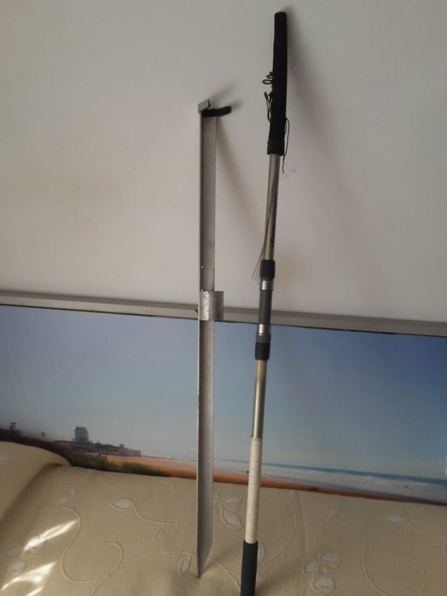 Set de pesca que incluye una caña y un pincho para sujetarla en la arena. - Caña de pescar telescópica. - Pincho metálico para fijar en el suelo.