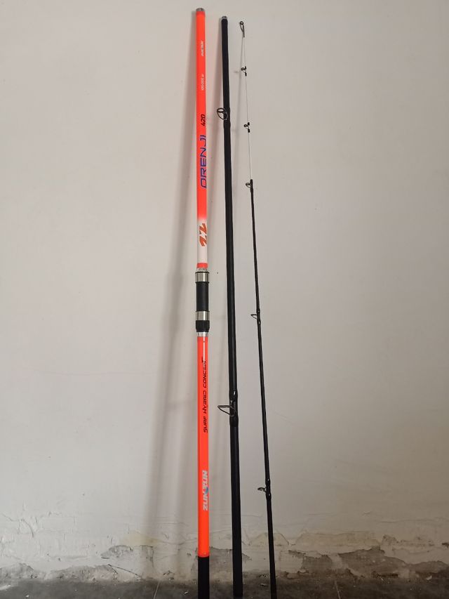 Detalles del producto100/200gr. 420 ORENJI surf hibrid concept. Esta nueva solo se a utilizado una vez el cartel si tiene uso, hilo recién cambiado. La caña viene con funda y con factura de compra 16/09/2025