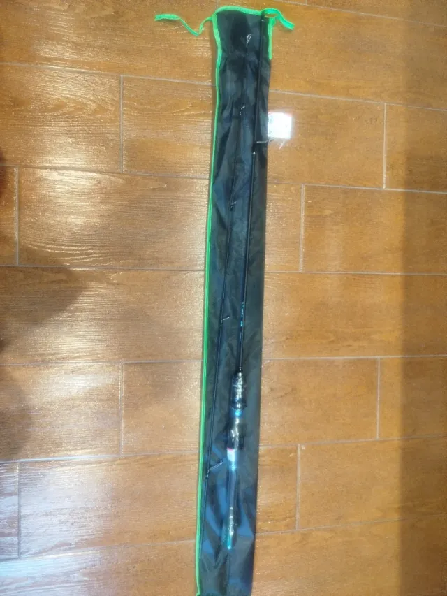 Caña de spinning TAIGEK en su funda protectora. - Funda de color negro con ribete verde. - Cierre con cordones. - Longitud: 1,68 m - Acción: Fast - Power: UL - Línea: 2 - 8LB