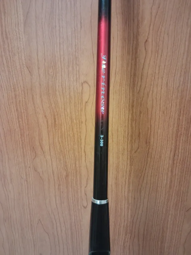 Detalles del productoCaña de pesca Protako Fieriness, modelo 3-300, diseñada para la pesca de calamar. Presenta un diseño degradado en tonos rojos y negros.