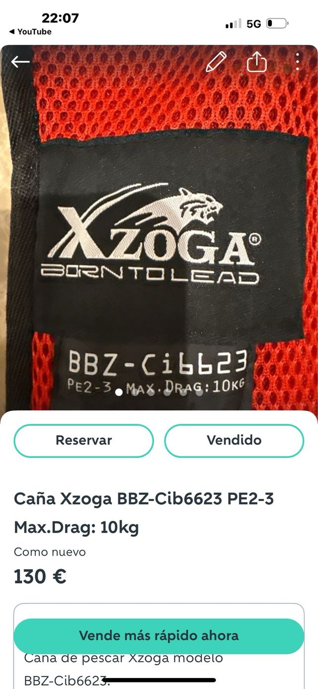Caña de pescar Xzoga modelo BBZ-Cib6623. - Longitud: PE2-3. - Resistencia máxima de arrastre: 10kg. - Estado: Como nuevo.