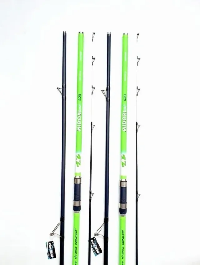 Detalles del productoPareja de Cañas Zun Zun Midori 4.20 Híbridas, Fabricadas en carbono composite, Acción 100-200, Anillado reforzado SIC Low Rider para una mejor salida de la línea de pesca y Portacarretes a rosca DPS.
