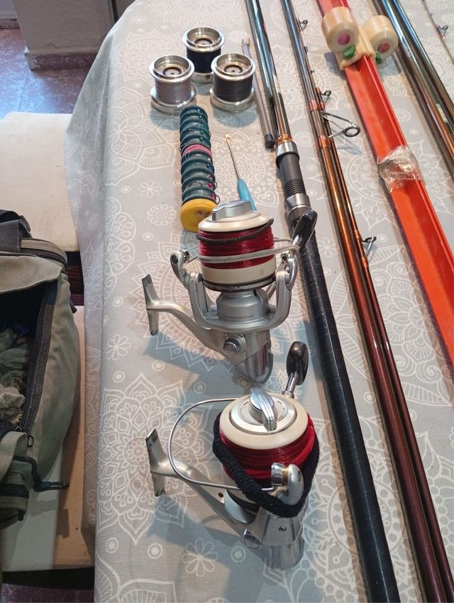 Lote de material para pesca. - Varias cañas de pescar. - Múltiples carretes de pesca. - Ropa y utensilios adicionales para la pesca.