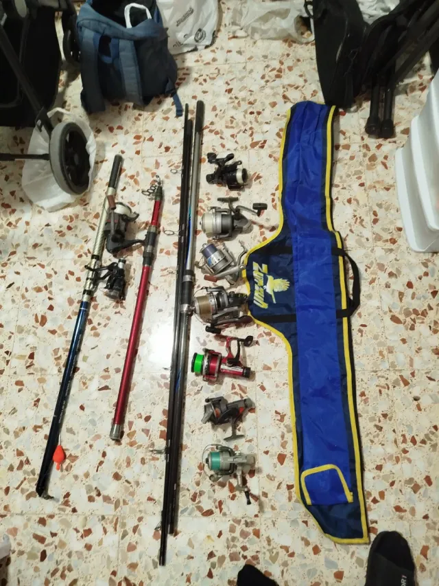 Conjunto de cañas y carretes de pesca. - Incluye varias cañas de pesca de diferentes tamaños. - Varios carretes de pesca. - Bolsa de transporte para cañas.