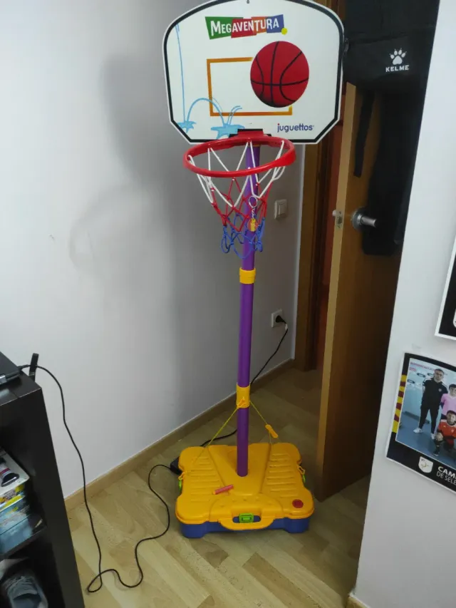 Canasta de baloncesto infantil con base rellenable. - Aro rojo con red. - Altura ajustable. - Base amarilla y azul.