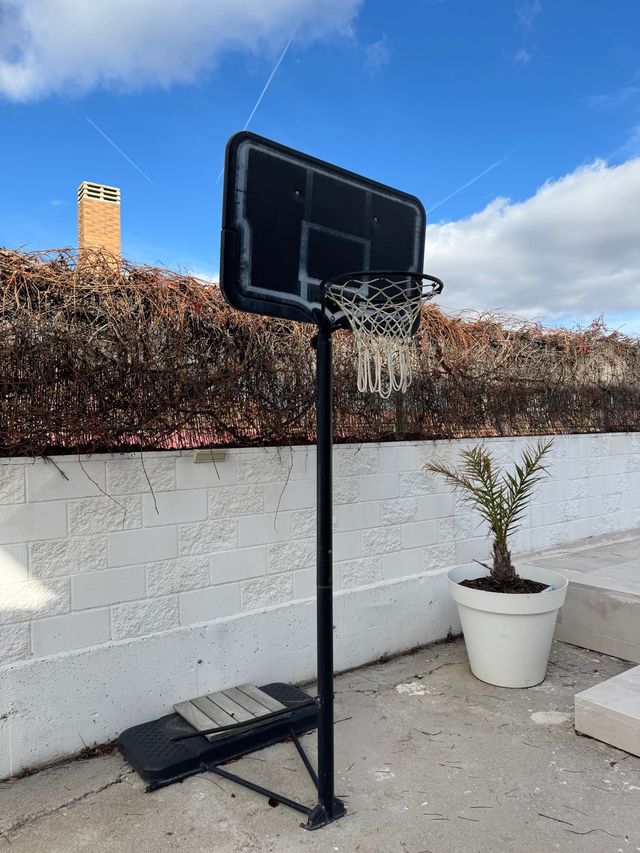 Canasta de baloncesto con altura regulable. - Aro de metal. - Red de nylon. - Base para rellenar con agua o arena.