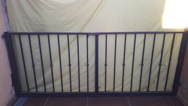 Detalles del productoCancela de hierro de doble puerta con pestillo bajo y cerrojo (posiblidad de colocar candado), se puede dejar una fija y otra abatible o abrir las dos.