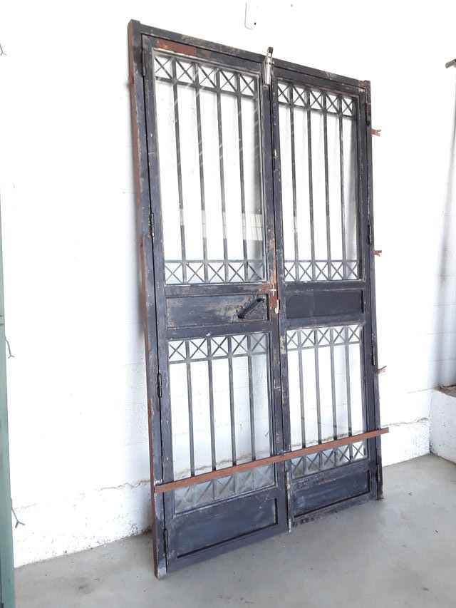 Dos puertas de hierro acristalado de dos hojas. Una mide 1,38m de ancho x 2,35m de alto y la otra 1,33m de ancho x 2,35m de alto. Precio por unidad 400€ (484€ con IVA)