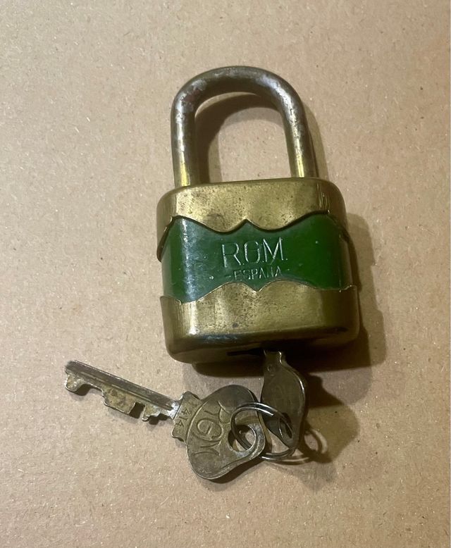 Candado antiguo ROM de España, en buen estado. Incluye dos llaves. - Marca: ROM. - Fabricado en España. - Color verde y dorado. - Aspecto antiguo y resistente.