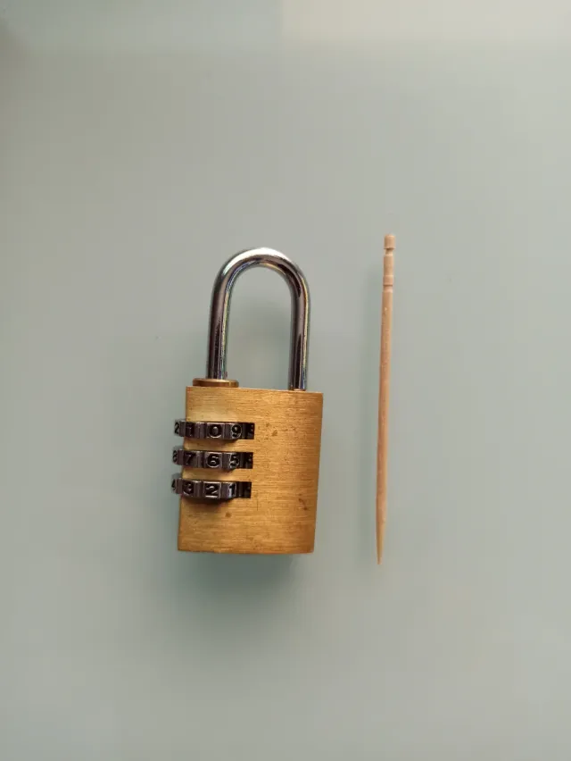 Candado de combinación de latón con diales numéricos. - Cuerpo metálico dorado. - Tres diales para establecer la combinación. - Grillete de metal plateado.