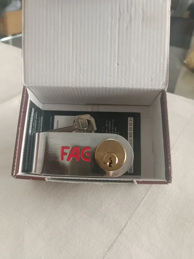 Candado FAC modelo 506/50 con dos llaves. Cuerpo metálico plateado. Cilindro dorado. Marca FAC visible en rojo. Se compraron 2 y éste no se ha estrenado.