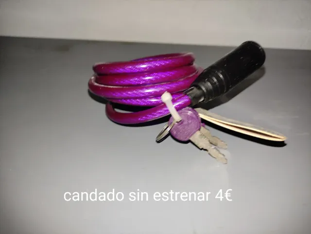 Detalles del productoCandado de cable morado, ideal para asegurar bicicletas o equipaje. Viene con sus llaves y está en perfecto estado.