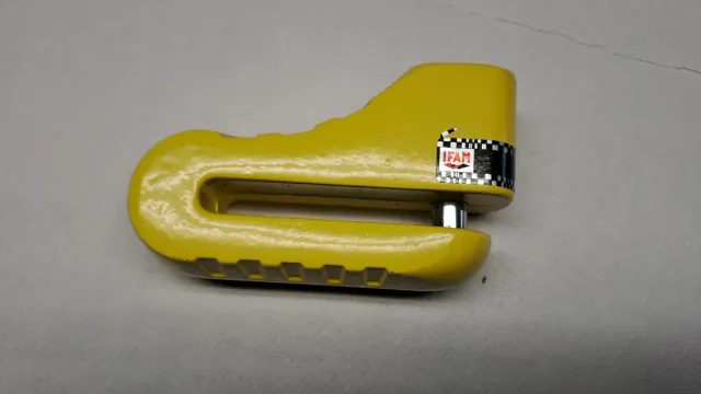 Detalles del productoCandado de seguridad de color amarillo, ideal para motos y bicicletas. Cuenta con un diseño robusto y el distintivo de la marca IFAM.