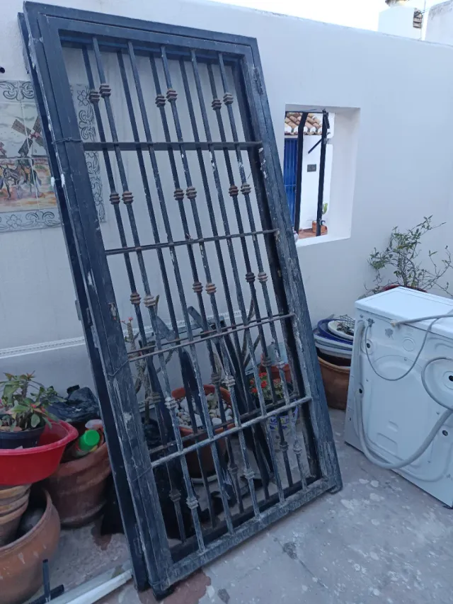 - Diseño con barrotes verticales y detalles ornamentales.