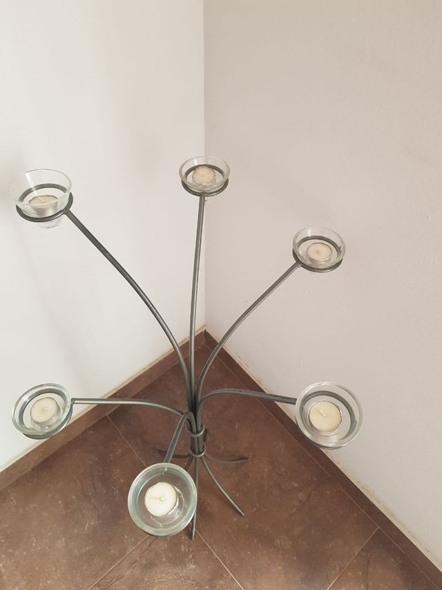 Candelabro de metal con 5 portavelas de cristal