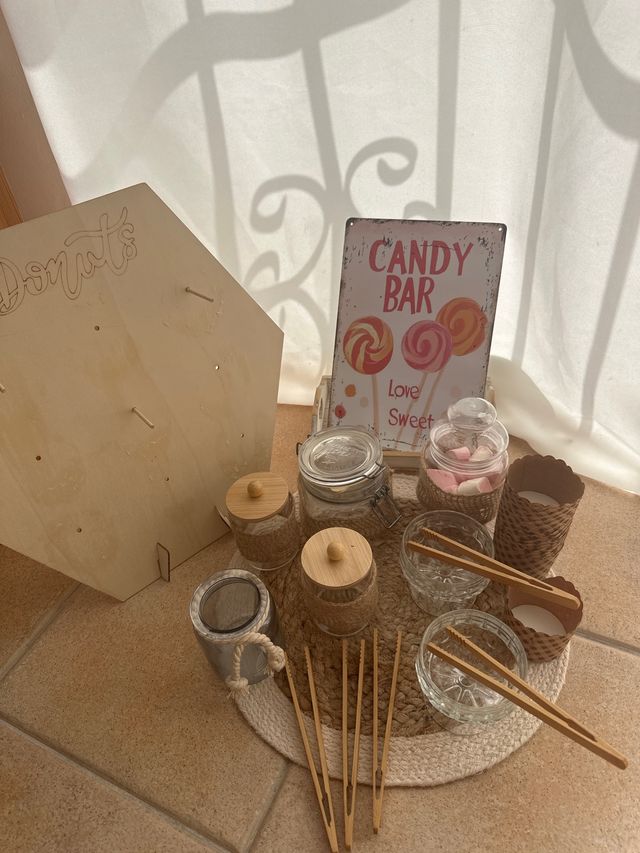 Detalles del productoSet completo para crear una mesa dulce o candy bar, perfecto para bodas o eventos especiales. Incluye varios elementos decorativos y funcionales.