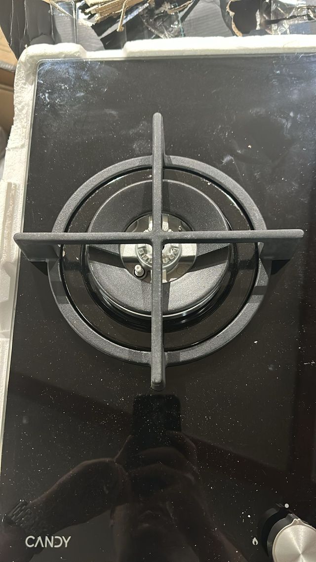 Placa de gas Candy con cristal templado y rejillas de hierro fundido, ideal para cocinas modernas. Compatible con gas natural y butano, con válvula de seguridad Sicurflame para máxima protección. LPNHK271053305 - A.21