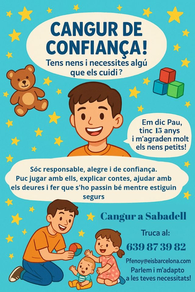 Hola! Em dic Pau i tinc 15 anys. Tinc experiència amb fer de cangur. Tinc un títol de premonitor i parlo 4 idiomes: Català, Español, Anglès y Frances.