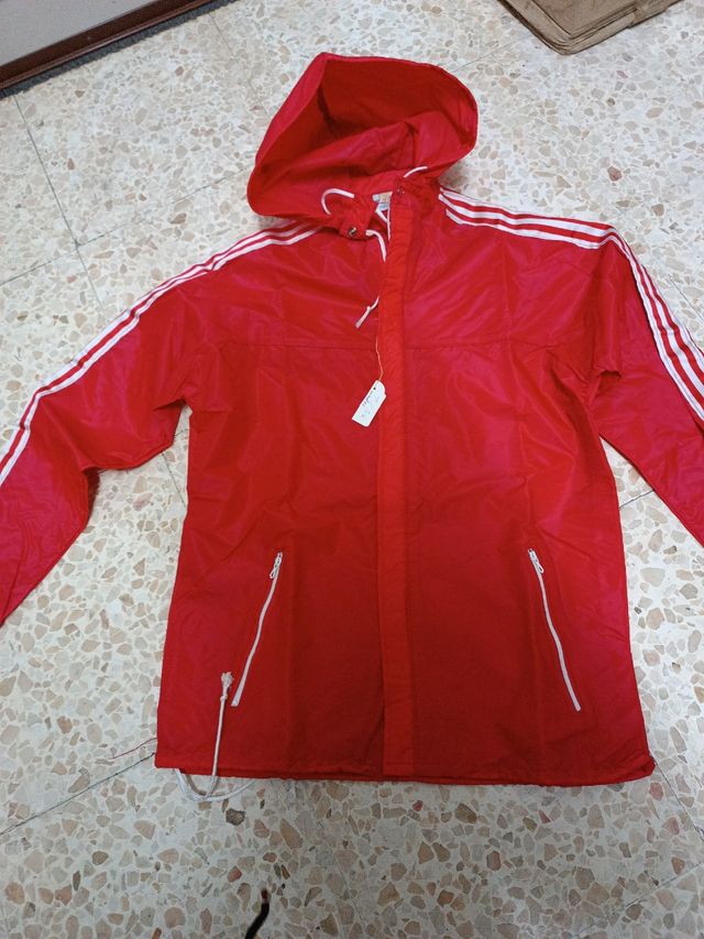 Detalles del productoCortavientos abierto con capucha con cordón ajustable cabeza y cintura. Con dos bolsillos con cremallera.mangas con gomas y tiras blancas . Espalda con ventilación. Color rojo talla 36
