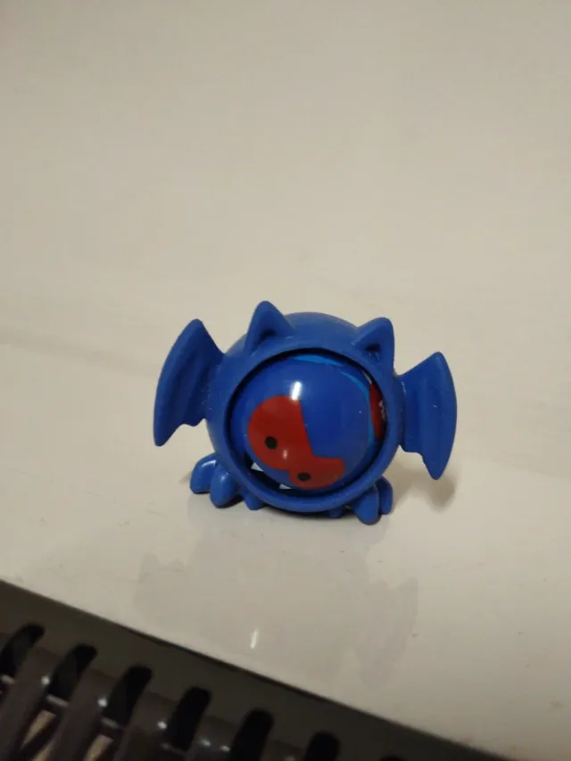 Detalles del productoCanica coleccionable de color azul con detalles rojos y alas.