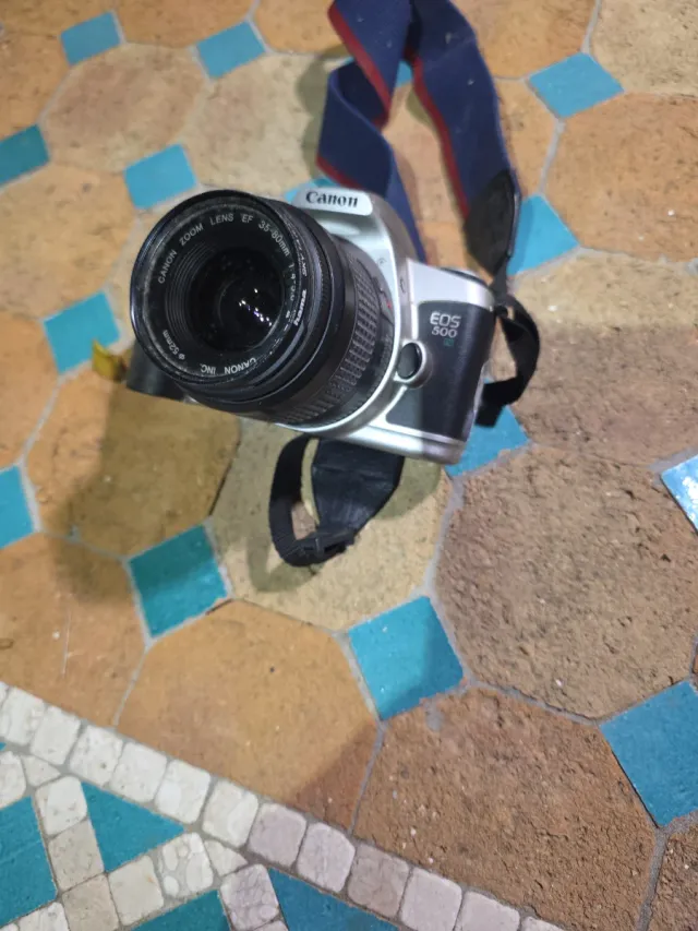 Cámara réflex analógica Canon EOS 500 con objetivo zoom. - Objetivo Canon Zoom EF 35-80mm 1:4-5.6. - Montura Canon EF. - Correa de transporte incluida.