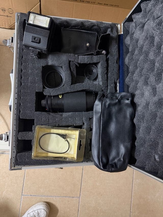 Kit de fotografía Canon con objetivo y accesorios. - Objetivo de cámara. - Flash. - Funda de cuero. - Bolsa de transporte. - Cable accesorio.
