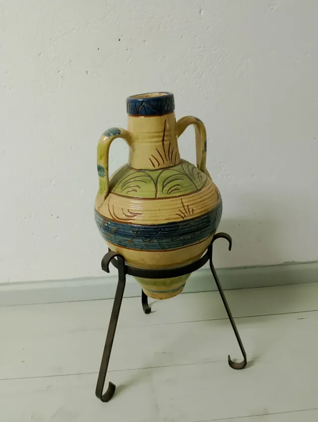 Detalles del productoCántaro de cerámica con un diseño tradicional y un pie de metal.