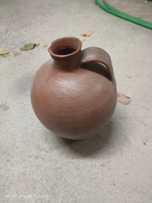 Cántaro de barro tradicional, ideal para decoración o uso. - Material: Barro cocido. - Color: Marrón terroso. - Diseño rústico.