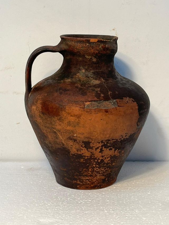 Detalles del productoCántaro o jarra de tamaño reducido con una forma globular y un asa vertical prominente. La cerámica presenta un color oscuro, probablemente debido a la cocción o a una pátina de uso, con algunas zonas que revelan el tono terracota más claro del barro. La boca es ancha y el diseño es simple y utilitario
