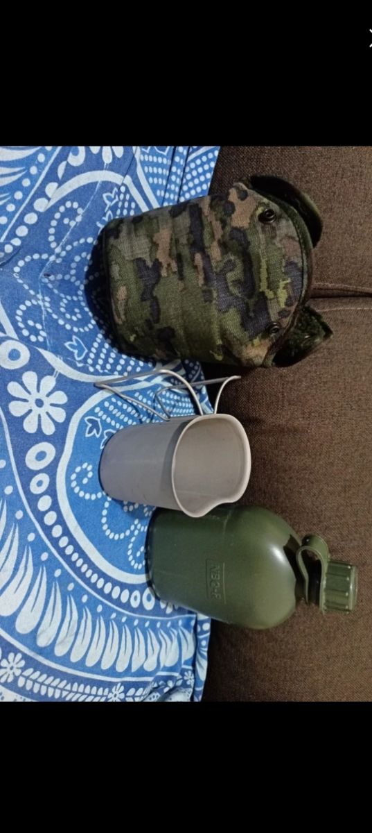 Set de cantimplora militar con funda y vaso. - Cantimplora de plástico verde. - Funda de camuflaje. - Vaso de metalico