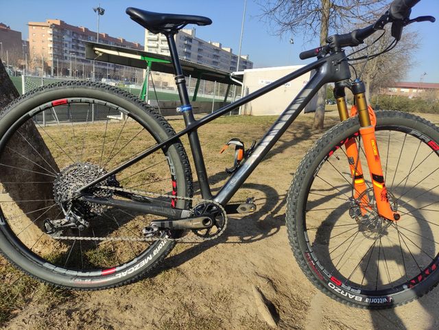 Detalles del productoTalla S. Bien cuidada. Horquilla Fox 32 SC Factory, recubrimiento Kashima. Llantas Progress Dyn 29", muy ligeras y rodadoras. Cubiertas tubelizadas Vitoria Barzo y mezcal ( con muy pocos kilómetros). Frenos Level TLM (recién revisados). Transmisión sram X0 con mando grip shift X01, bielas X1, plato 34D y cassette 12v. Pedales Shimano XT. Tija telescópica Brand Ascend. También incluyo tija original (Thomson) .Peso con tija telescópica 10,10kg.