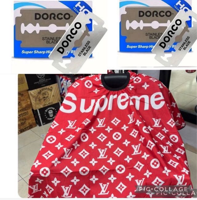 Detalles del productoVendo capa de corte para peluquería con estampado Supreme y una cuchilla Dorco, ideal para barberos. La capa está en buen estado y la cuchilla es nueva.