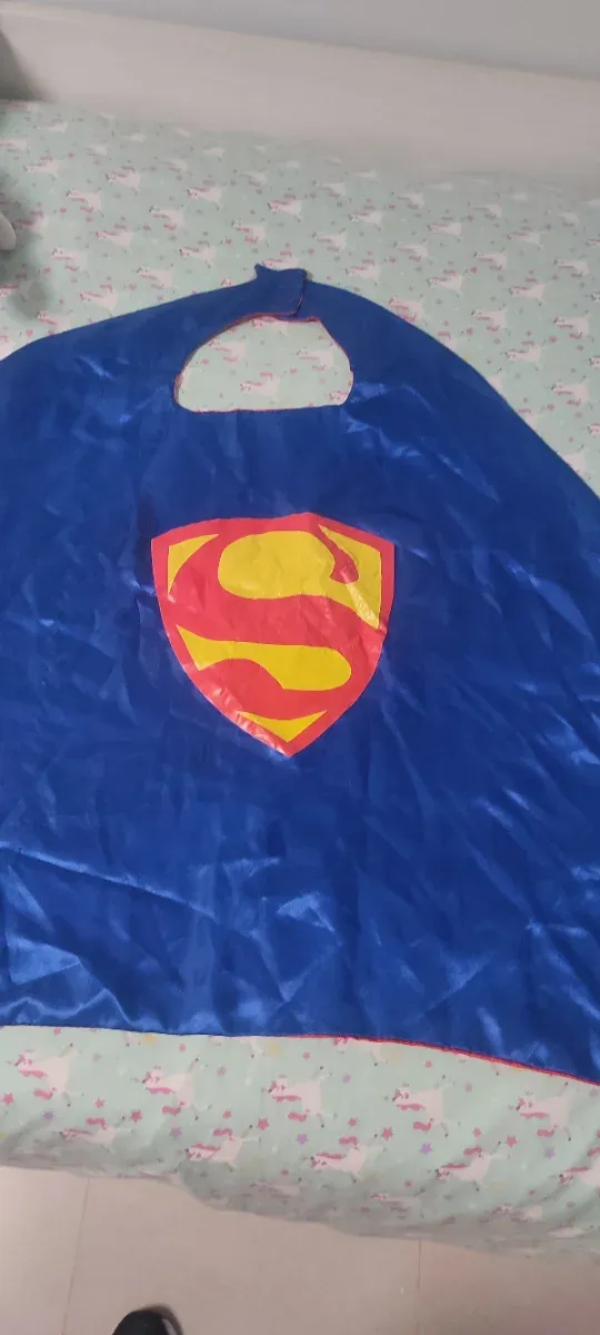 Capa de superhéroe con el escudo de Superman. - Color azul. - Escudo de Superman en rojo y amarillo.