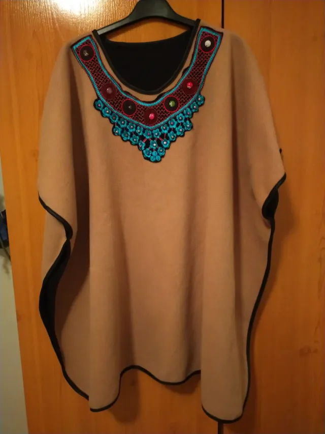 Capa o Poncho Beige Multicolor Adornado