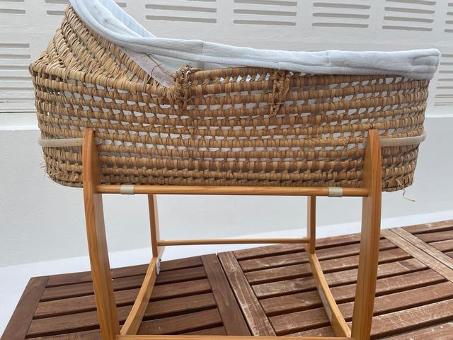 Detalles del productoCuna-Cuco-Capazo de Ratán con patas de madera para apoyarla y poder mecer al bebé.