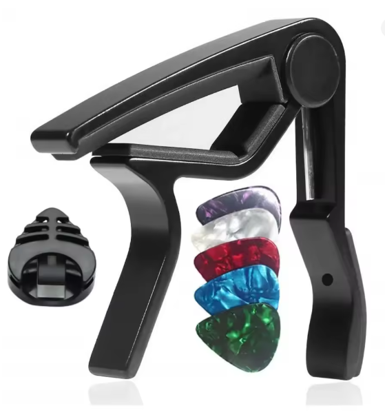 Detalles del productoCejilla negra para guitarra con puas y portapuas adhesivo, nueva, para todo tipo de guitarras bajo ukelele guitalele etc.