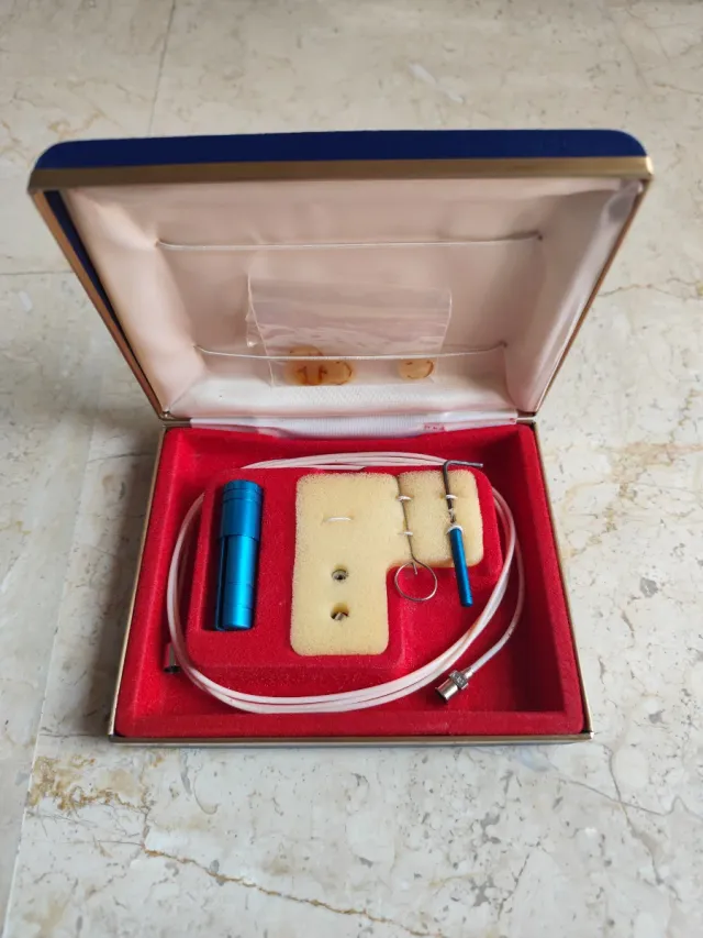 - Estuche azul y rojo con interior de terciopelo.