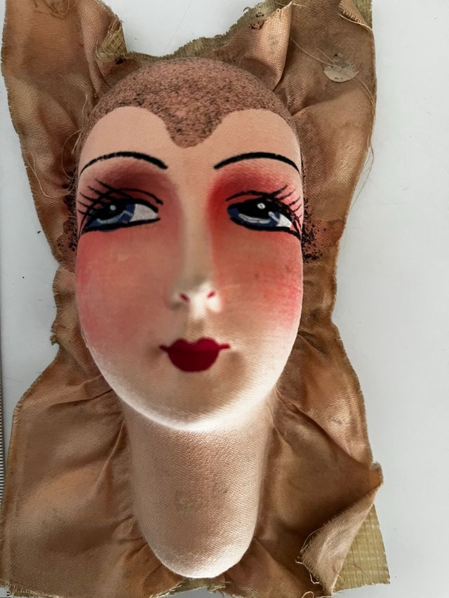 Cara de muñeca antigua de tela, de estilo francés. Presenta un diseño detallado y expresivo. - Material: Tela. - Estilo: Francés antiguo. - Detalle: Pintura facial elaborada.
