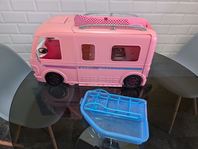 Detalles del productoPreciosa caravana de Barbie en color rosa, en buen estado. Incluye una pequeña piscina azul.