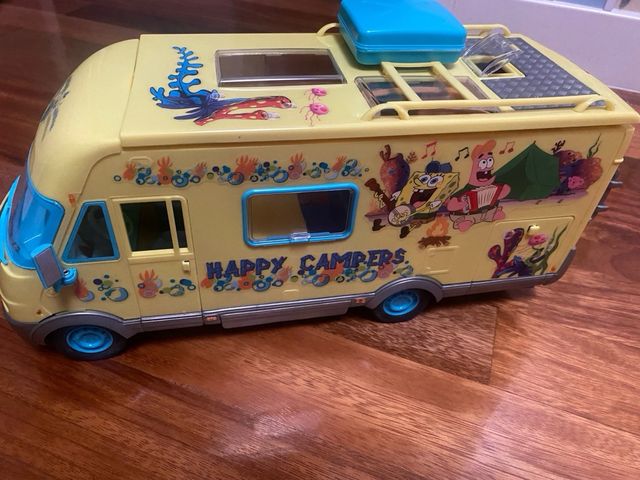 Caravana autobus Bob Esponja, accesorios de camping, mesa, sillas y toldo.