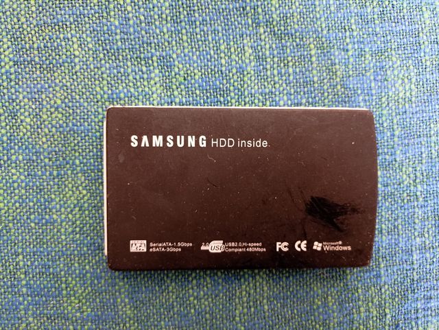 Carcasa de disco duro externo serial ATA con conexión USB2 marca Samsung. Incluye cables,kit de montaje y funda.