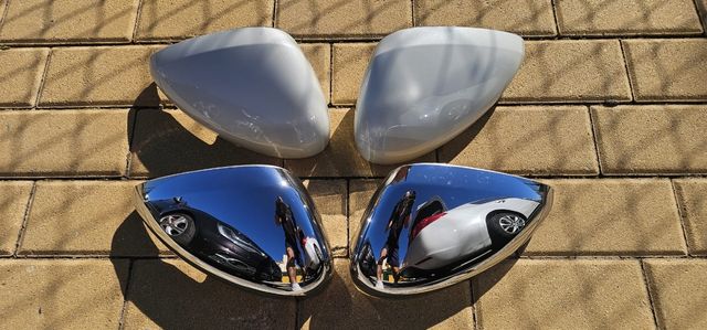 Detalles del productoJuego de carcasas para espejos retrovisores de coche. Una de las carcasas es cromada y la otra es blanca nacarada
