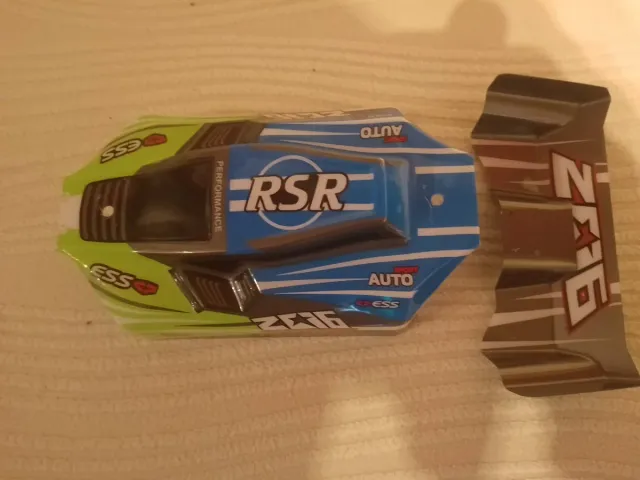 Detalles del productoCarcasa y alerón para coche RC modelo 144001. El diseño presenta colores llamativos y detalles gráficos.