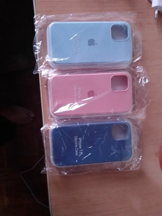 Detalles del productoDos fundas de silicona para iPhone 12 de la marca Apple. Una es de color azul claro y la otra azul oscuro.