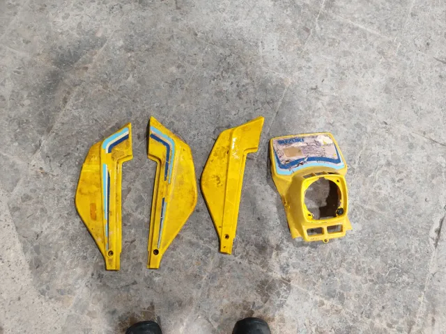 Conjunto de piezas de plástico amarillas para Suzuki Minicross. - Incluye frontal y laterales. - Diseño con detalles en azul y blanco. - Piezas originales.