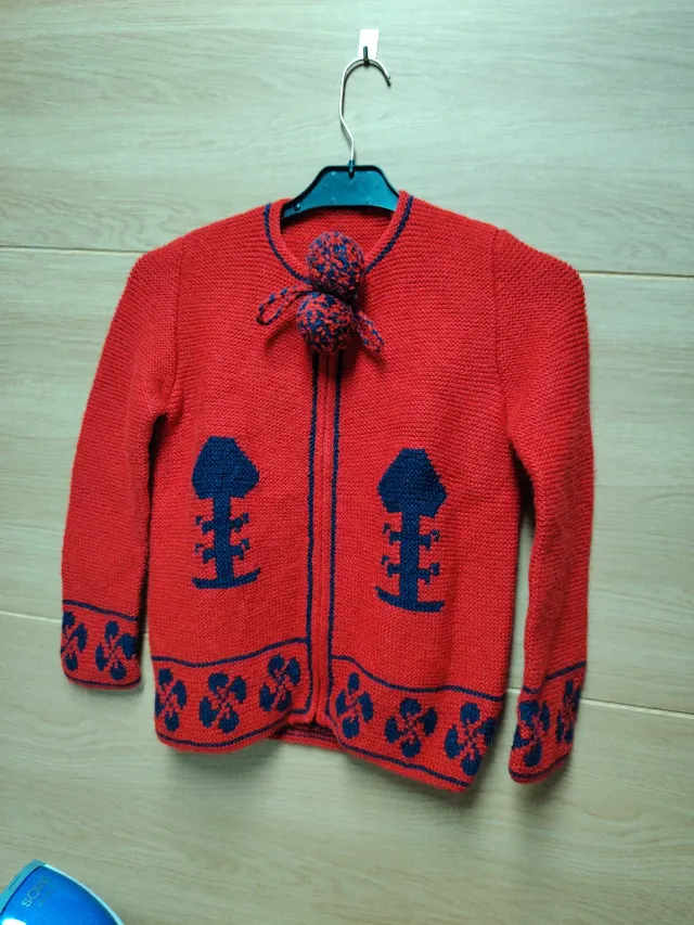 Detalles del productoCárdigan de punto rojo para niño, hecho a mano con detalles en azul marino.