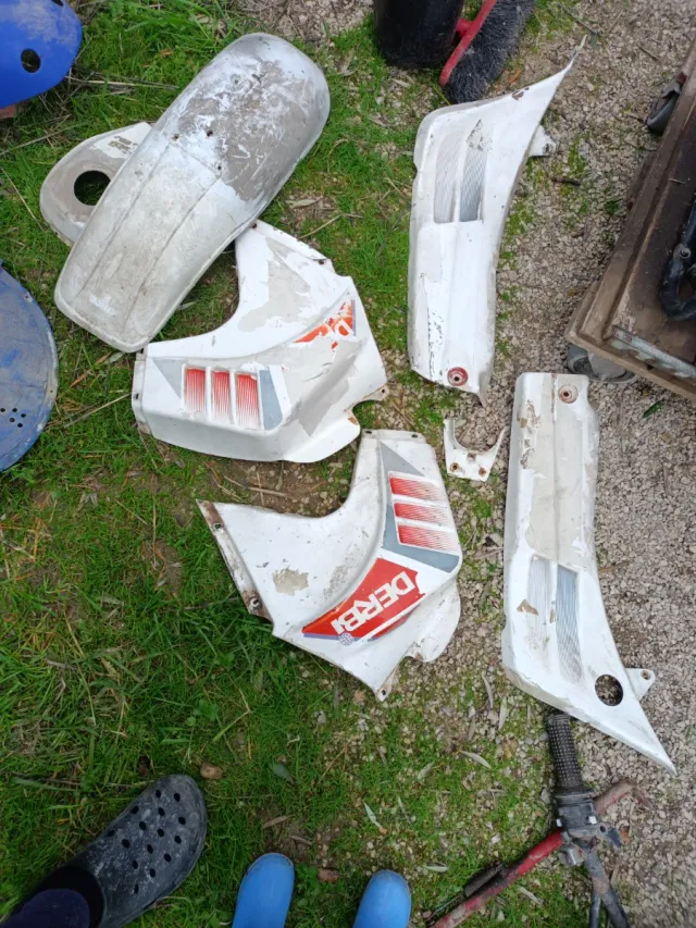 Conjunto de piezas de carenado para Derbi Savannah. - Piezas de plástico blanco. - Diseño con detalles en rojo y gris. Están para reparar pero son las originales.